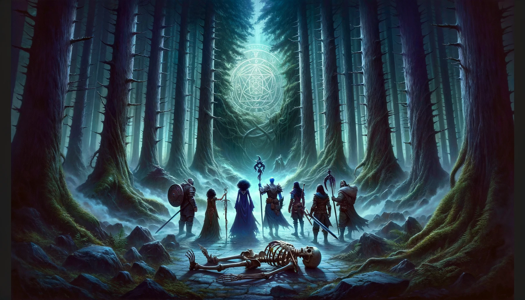 As they ventured deep into the woods, a grim stage presented itself—a dwarven skeleton, once a cleric named Gruff, lay picked clean beside an amulet of potent magic. This relic, promising the power of resurrection, drew the party into a solemn pact with the past. Invoking its magic, they summoned Gruff's spirit, who implored them to bury him and his fallen comrades. His tale, one of ambition quelled by the wood's unforgiving nature, set a side quest before them, seemingly placed by fate or the whims of the gods.