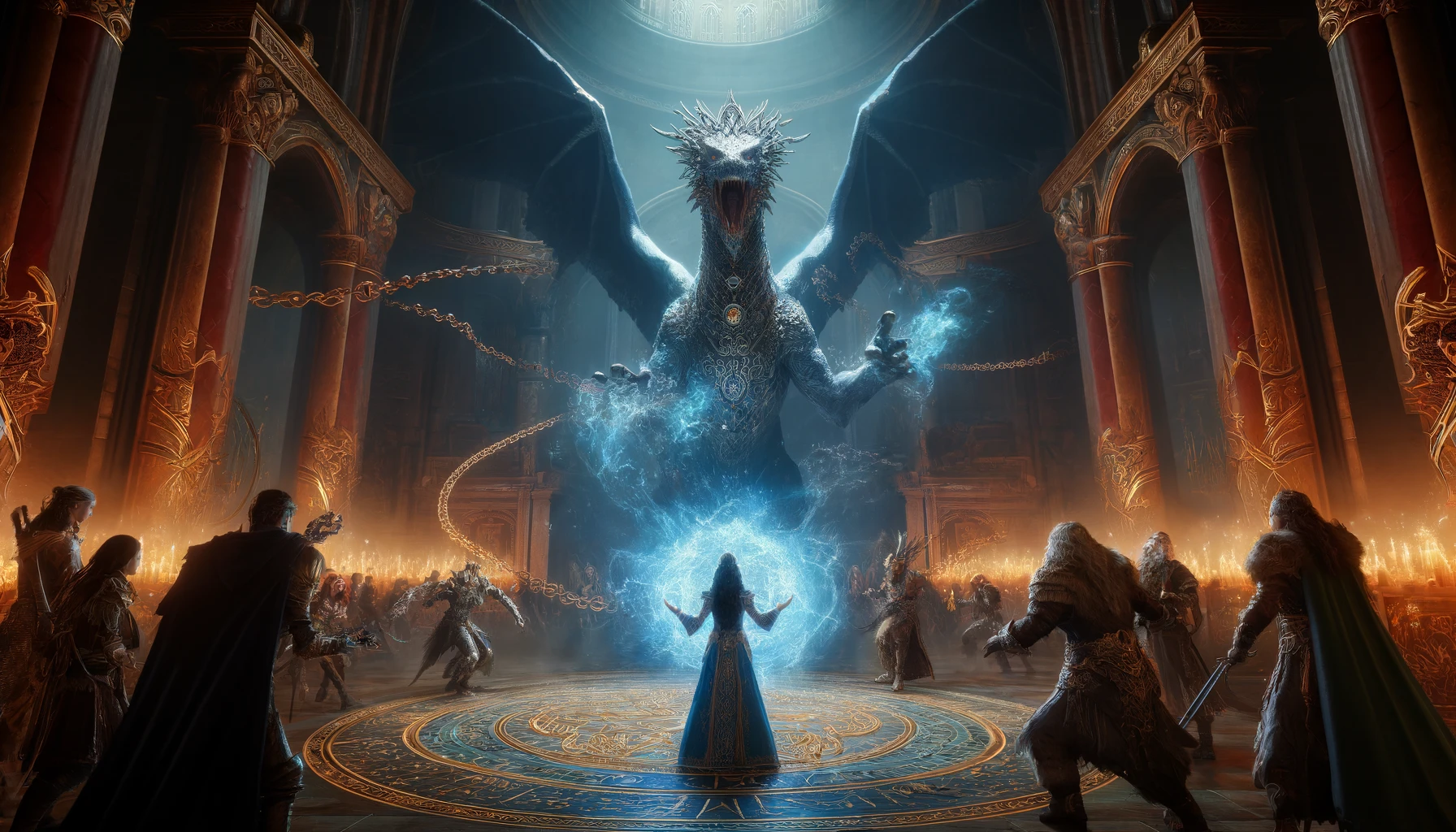 Stepping into the grand chamber, the adventurers are struck by the sight of Princess Elara, commanding and resolute, standing before Vermithrax, a massive sapphire dragon chained and struggling against her bonds. Runic symbols etch her scales, glowing faintly in the dim chamber light. Princess Elara stands, her back to them, one hand raised aloft, her fingers adorned with five shimmering rings channeling torrents of magic. The sapphire dragon, Vermathrax, roars in defiance, her chains rattling as she fights the magical binds. The room pulses with a palpable tension.