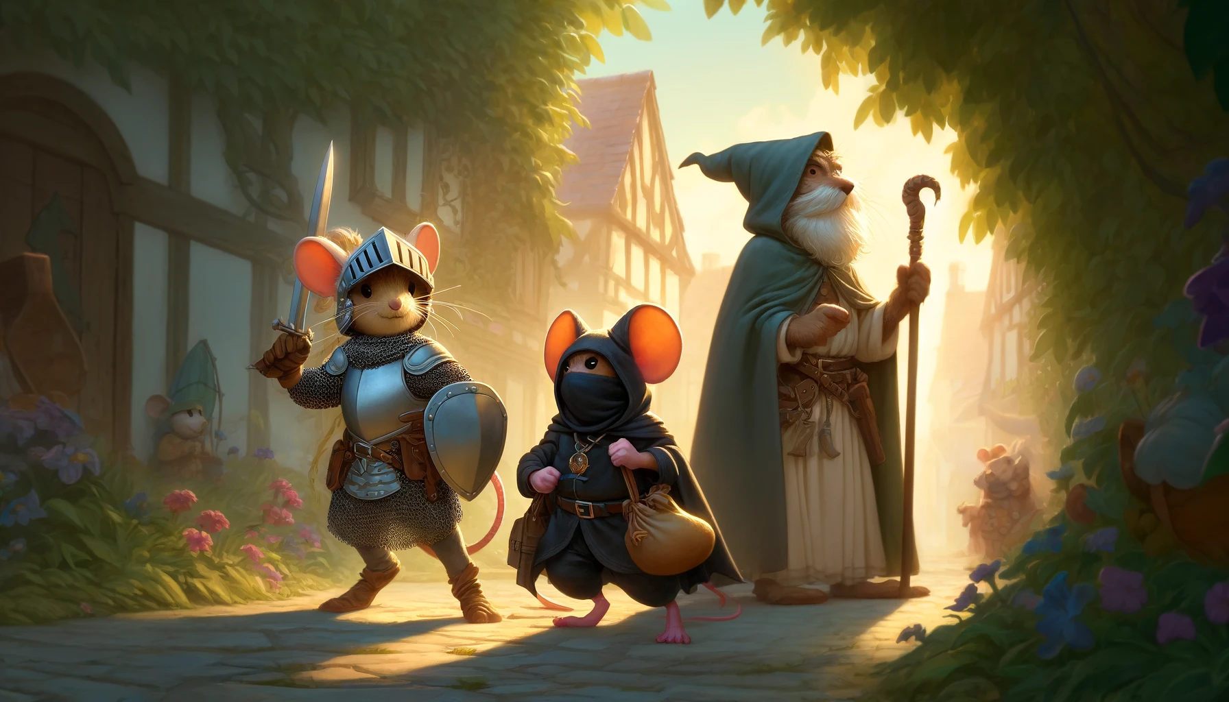 Among the peaceful mousefolk of Thornwick, there's a beloved game of chance and wit, known to all as "The Thief, the Knight, and the Wizard." It's a game where little paws make quick decisions, and children settle their squabbles in the cobblestone streets of Whisker's Hollow. Knight captures Thief, Wizard kills Knight, and Theif outsmarts Wizard. Simple, yes?