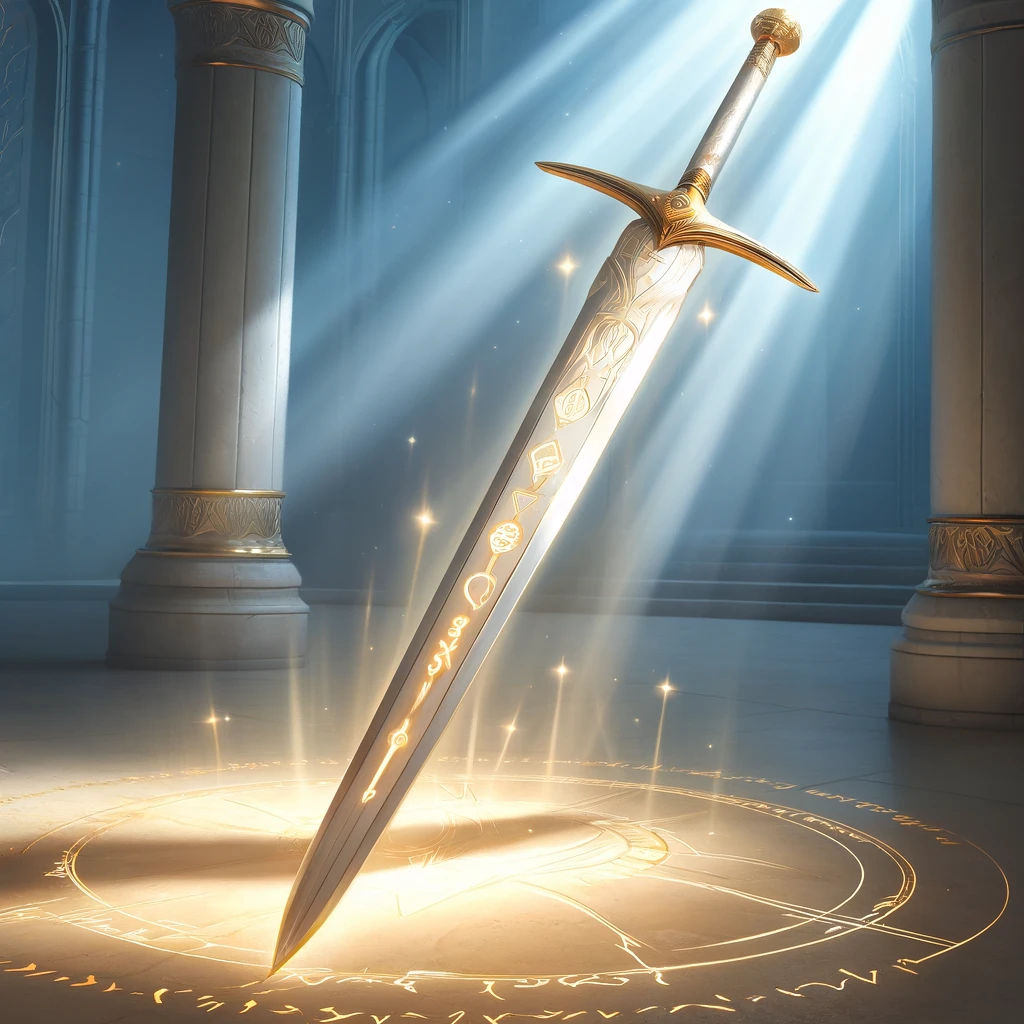 This gleaming white blade is inlaid with gold runes that glow warmly in the sunlight.